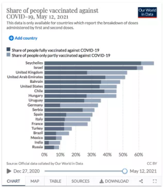 在疫苗接種這件事上,人少好辦事!塞舌爾很快就成為疫苗接種率最高的國家,全國人口中已接種完兩針疫苗的,佔61%!這個比例甚至超過了以色列。不僅如此,18歲以上者為目標接種人羣,該人羣中完成接種的比率甚至達到了86%.