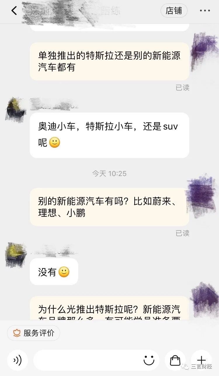 當三言財經問及新能源汽車品牌有那麼多為什麼只單單推出特斯拉時,對方沒有明確答覆,只是稱開法都是一樣的,油車也一樣。