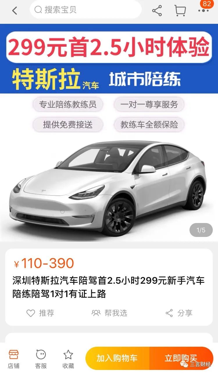 此外,三言財經還發現深圳也有一駕校上線了特斯拉陪練課程。售價一節課390,首次體驗價299。