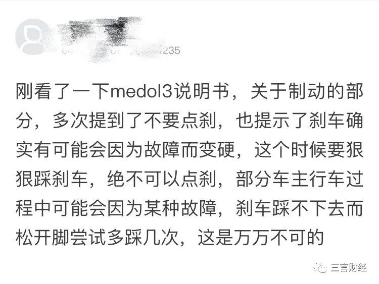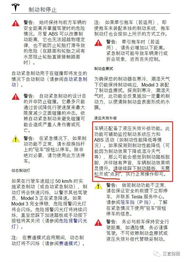 還有一位網友對Model 3説明書中,關於制動的部分進行了介紹。説明書中多次提示不要點剎,也提示了剎車有可能因為故障變硬。剎車踩不下去的時候鬆開腳多踩幾次是萬萬不可的。