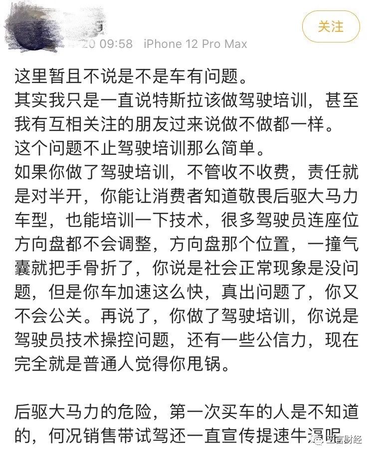 一位特斯拉資深用户認為與燃油車的區別是加速太快,有培訓的必要。因為燃油的豪車要實現快速的加速需要專門學習。
