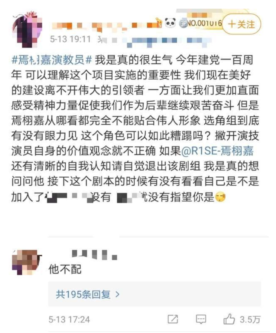 其他就不説了,但焉栩嘉飾演少年時期教員同志,讓大家很生氣,一個選秀出身、毫無作品和演技、黑料不斷的“劣跡藝人”,居然可以演共和國的締造者?可以演那個無產階級偉大的導師?