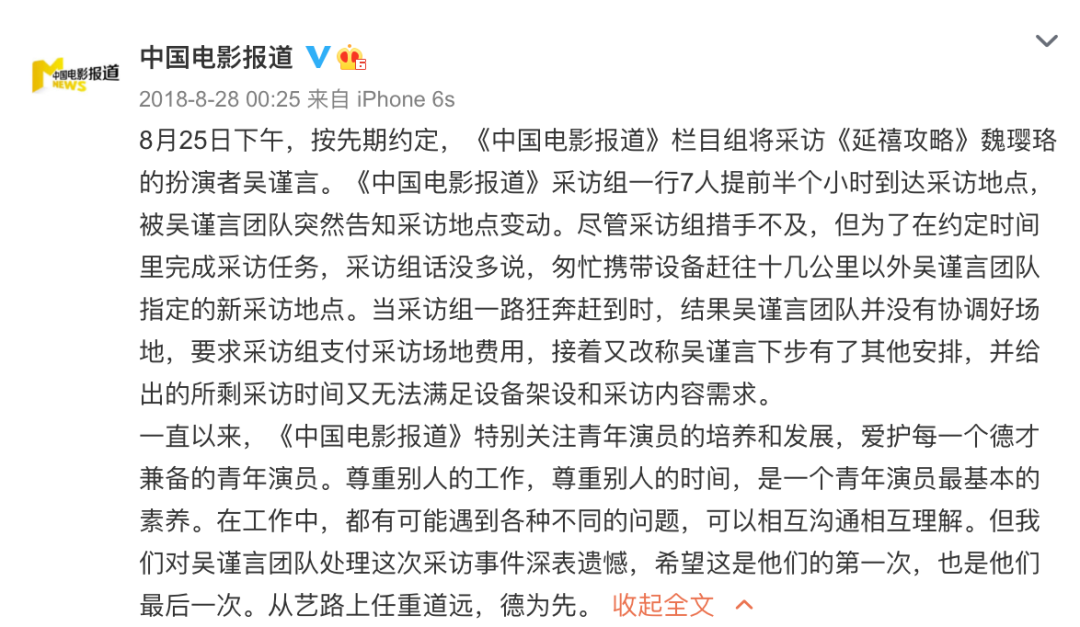 2018年,六公主旗下的《中國電影報道》採訪某大火劇的吳姓主演。