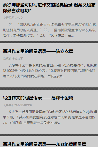 現在寫進去的句子本來就不是名言,或者只是複述了之前就有的道理,更多的句子則只是屬於錦上添花,那用啥不是用,用一手名言不好嗎,逼格有保障,老師還看得懂,現在被用成了三手文字,是不是差點意思。