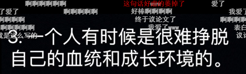 乍一看好像有點道理,但也不至於像彈幕裏一樣全都是“啊啊啊啊啊啊”“我真的好喜歡XXX”“絕了”那麼超凡脱俗,但凡看過(曾經被網紅一時的)《了不起的蓋茨比》的第一頁第一行都能找到比這句話更能得分的援引。