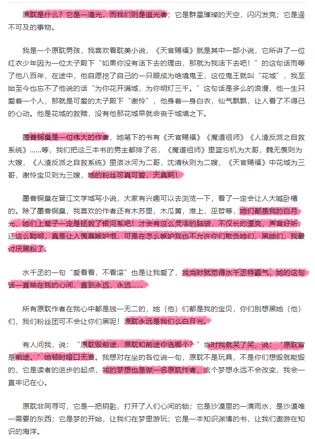 這種一類原耽作文,通篇以原耽作品和讚美原耽作品為核心思想,通常描寫原耽這一股清風/一陣微光/一縷香氣是怎樣讓他們漠然懵懂無趣的人生找到了全新的方向,從此原耽便是他們唯一的光,他們就是追!光!者!