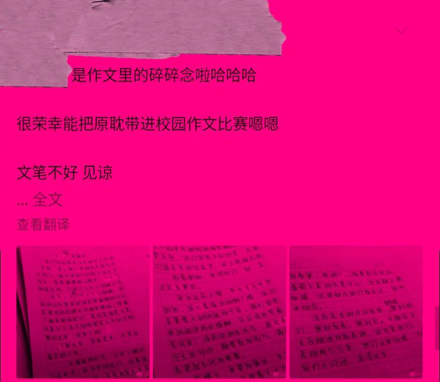 整篇的作文沒能找到幾篇,但是掛着原耽和耽美名頭的素材收集倒是不少,在#原耽女孩 這樣的超話下面,不時就會看見分享自己夾帶私貨心得和因為原耽作文和老師/同學“對上了暗號”而興奮不已的學生們。