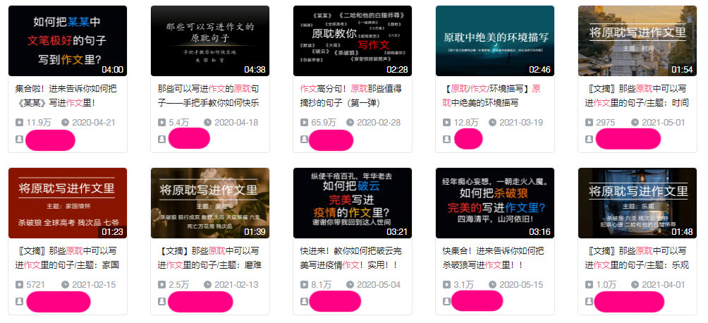 不少的耽美類營銷號和個人號都有在分這一塊的蛋糕,在這一水兒大同小異的集錦裏面,最引人注目的是這一系列的視頻,恨不得在封面就告訴你,引用原耽金句就能夠得到老師的慧眼識英才,成為全級仰慕的模範作文。