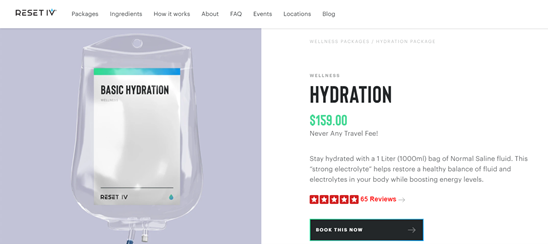 價值159美元的生理鹽水 | 圖片來源:Rest IV官網
