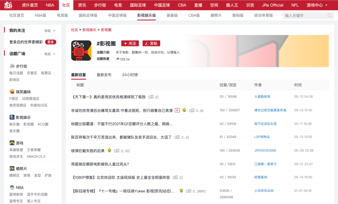發展至今,虎撲已經從專注於籃球資訊為主的社區論壇,成長為包含體育、遊戲、影視、步行街、女神評選等多個內容板塊的泛娛樂社區,其中,影視區虎撲值也成為針對直男羣體的營銷新陣地,娛樂明星、社會公眾人物的喜愛值也代表着直男審美、直男態度。