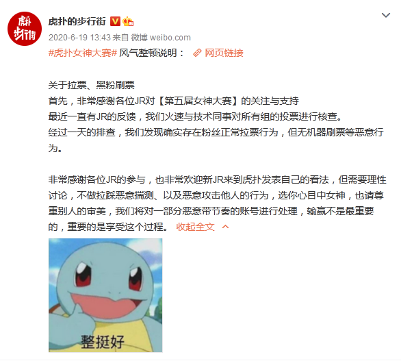 最後在這次的女神大賽刷票和控評行為出現後,虎撲社區慢悠悠地發佈了一條風氣整頓聲明,並表示會對“惡意帶節奏的賬號進行處理”。