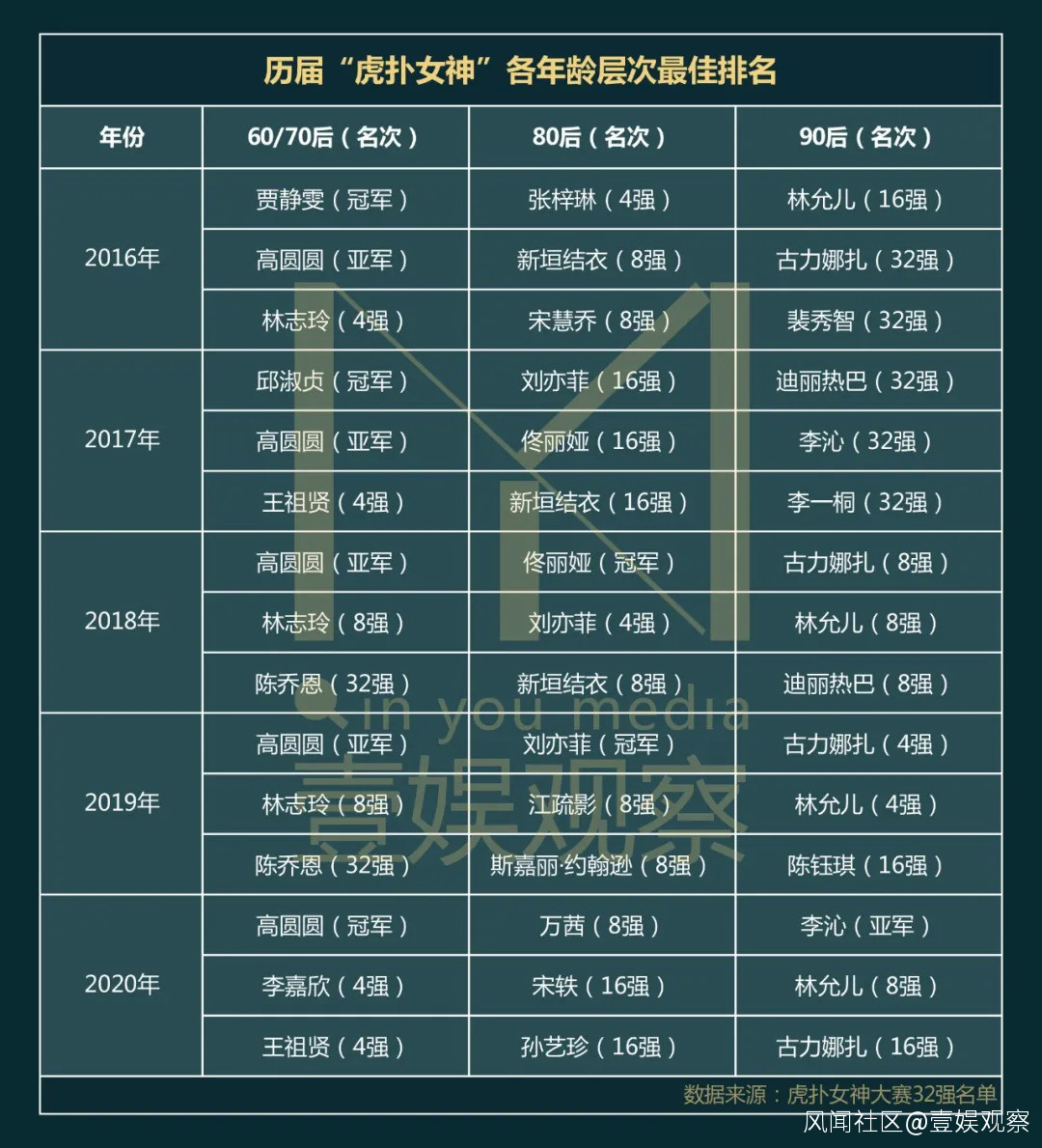 通過歷屆32強年齡層分佈顯示,主要活躍用户年齡為 24 ~35 歲的虎撲社區,JRs選擇的女神大多是和他們同齡的80後女星,甚至比他們年紀更大的 60 後 70 後女星,以上這些年齡段佔比78.21%,而目前娛樂市場上流量更高、熱度更強的90後羣體僅有21%。96年出生的乃萬概率相對減少。