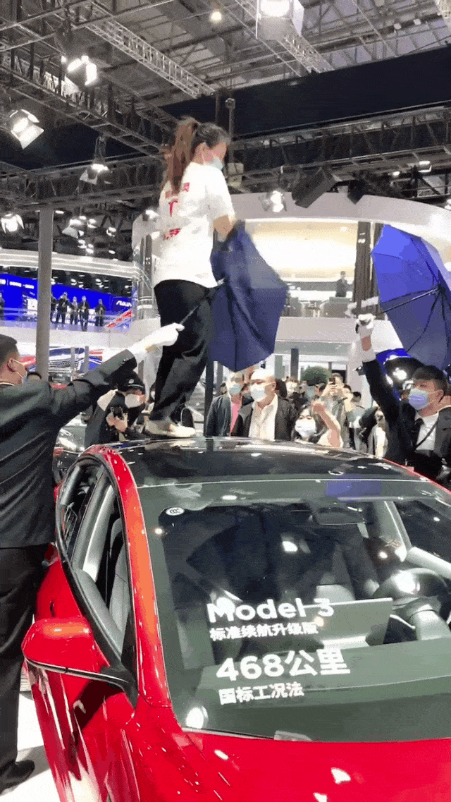 在上海車展站到特斯拉車子上面,高喊:“特斯拉剎車失靈”,着實為維護消費者的合法權益貢獻了自己的一份力量。