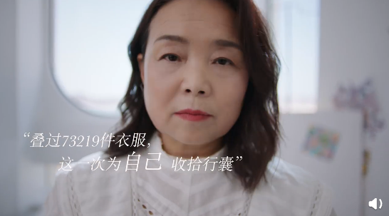 畫面中,蘇敏正埋頭收拾行李,廣告文案寫的是——“疊過73219件衣服,這一次為自己收拾行囊。”