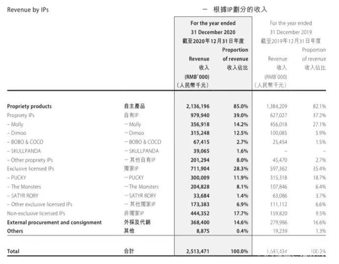 “自有IP”的Molly銷售佔比已下滑至14.2%;推出僅一年時間的Dimoo佔比12.5%;“獨家IP”中的PUCKY佔比11.9%(但較2019年的18.7%大幅下滑)。可以看出,這些IP的銷售業績開始與Molly分庭抗禮。
