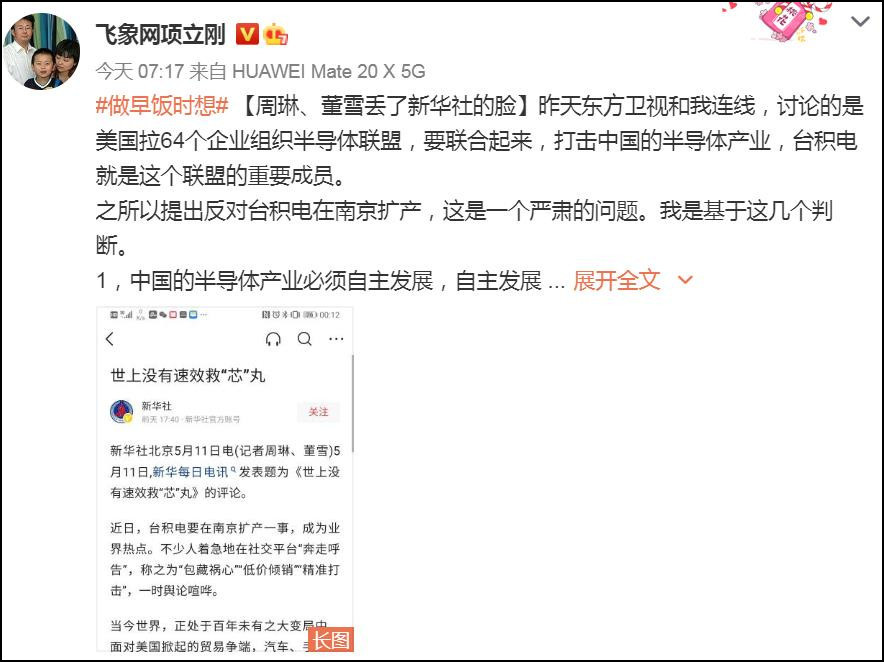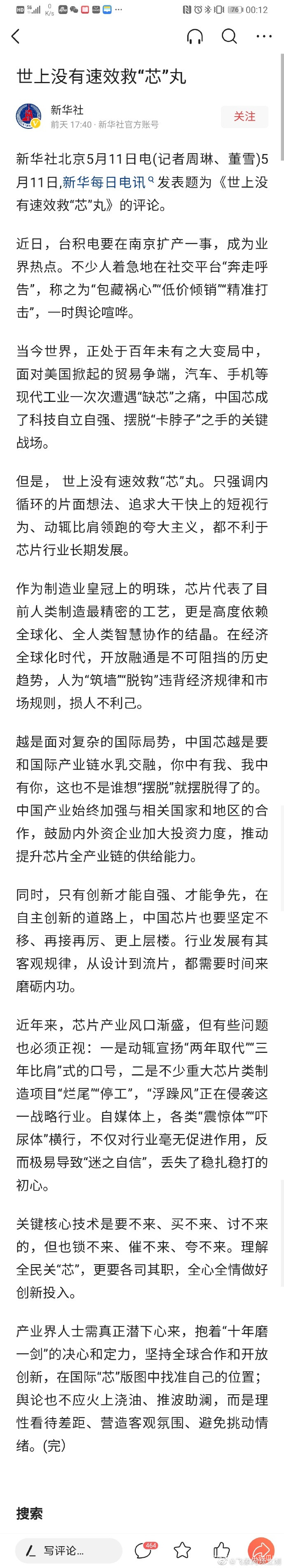 對於這些問題,新華社願意做認真的討論,我也很歡迎,但兩個分社的女記者,對芯片產業從無研究,沒做認真的採訪,卻用評論來下場為一方站台,這個評論充滿套話、空話、大話、廢話,講不出一點道理,文風空洞,表述粗淺。這樣的文章也會被髮出。