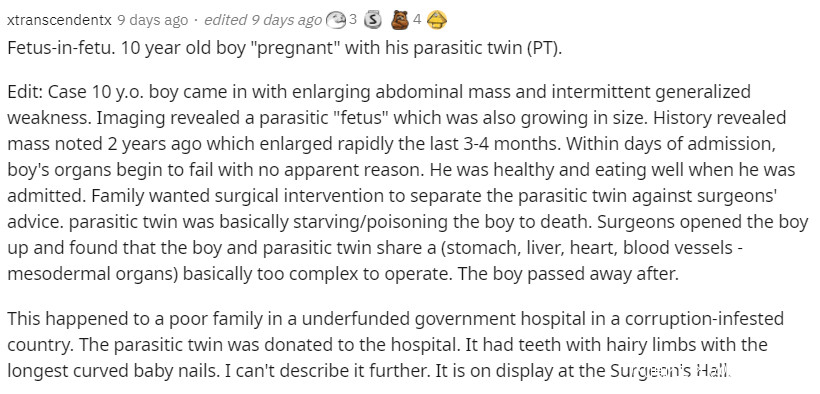 當時是一名10歲男童因為腹部腫塊增大及間歇性全身虛弱而入院,成像顯示他身體裏有一個寄生的‘胎兒’也在不斷長大,