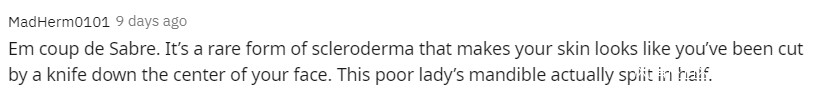 它會讓人的皮膚看起來像被刀從臉中間割開了一樣,我診斷的那位可憐女士的下頜骨就因為這病裂成了兩半!”