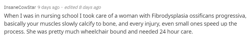 “我之前還在護理學校唸書的時候,照顧過一位患有漸近性骨增生症的婦女,