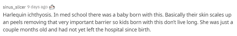 基本上患者的皮膚會鱗片化,干擾皮膚脱落死皮細胞的能力,所以這個孩子生來就註定是活不長的,