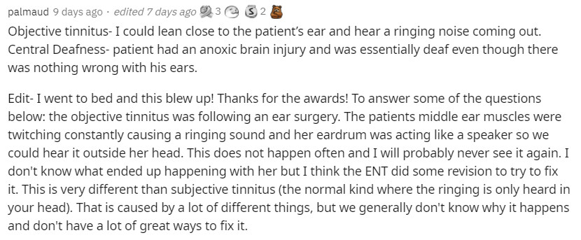 “我碰過最罕見的應該是客觀耳鳴這種病了,就是靠近患者耳朵時能聽到一種響亮的噪音,