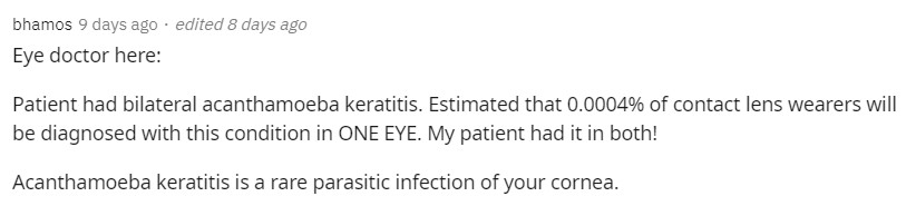 結果我那位病人竟然兩隻眼睛都染上了,關鍵是棘阿米巴角膜炎的致盲率非常高啊…”