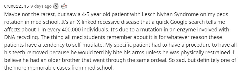 “我説的這個可能不是最罕見的,就是我在醫學院輪班到兒科時見過一個患有萊施·尼漢綜合徵(又稱自毀容貌症)的4歲小孩,