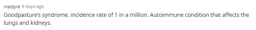 “古德巴斯捷氏病夠罕見了,發病率為百萬分之一,是一種影響肺部和腎臟的自體免疫疾病…”