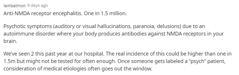這是一種自身免疫性疾病引起的精神病症狀(會產生幻聽或幻視、偏執及妄想症),因為身體在產生針對大腦中NMDA受體的抗體,