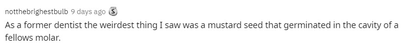 “曾經作為一名牙醫的我,見過最奇怪的事兒無非就是一顆芥菜籽在一個病人的臼齒裏發芽了…”