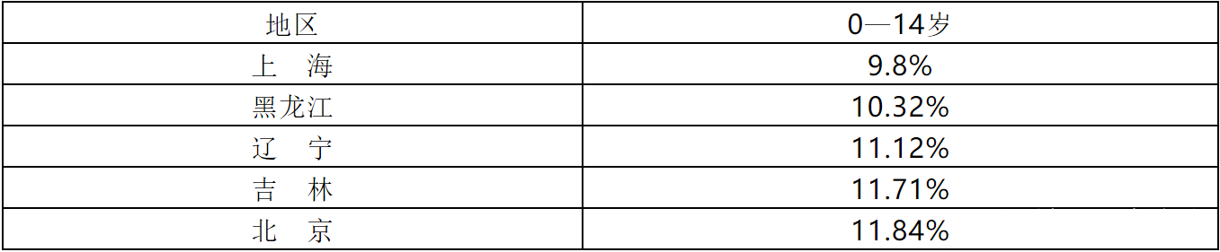 一是14歲及其以下人口比例全國最低是上海,然後是黑龍江,遼寧,吉林,北京。
