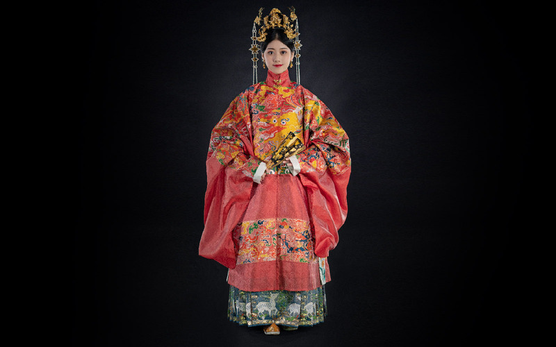 這些走高端定製路線的商家中,最為出圈的便是明華堂。明華堂創立於2007年,對漢服形制、布料織造、紋樣設計都十分考究。因而,儘管其一套妝花蟒袍搭配織金紗裙可達萬元,但瀏覽其官網發現,該店工期已經排到了2022年的3月下旬。
