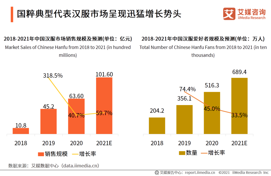 艾媒諮詢今年1月份的報告顯示,中國漢服愛好者數量規模和市場規模快速增長,預測2021年漢服愛好者數量規模達689.4萬人,市場銷售規模將達到101.6億元。