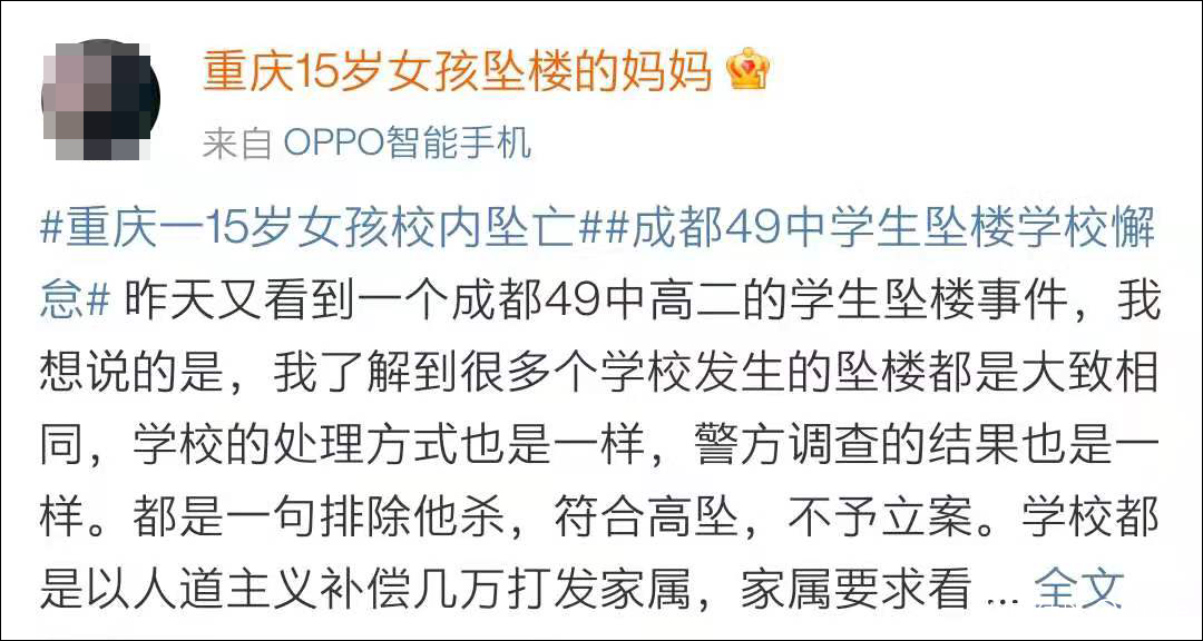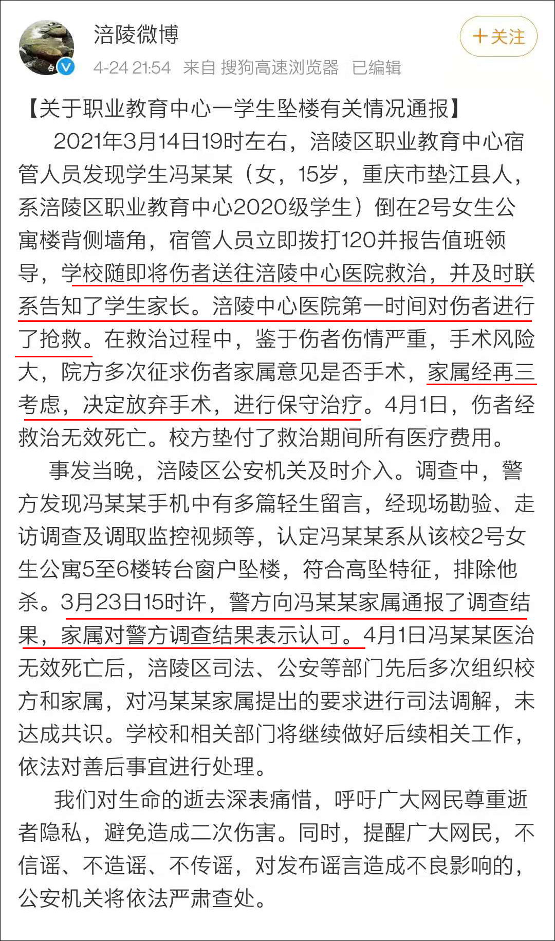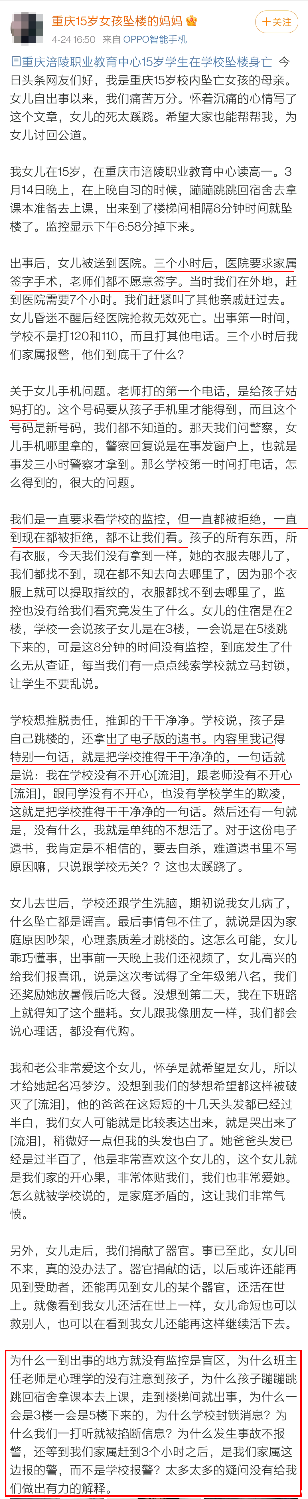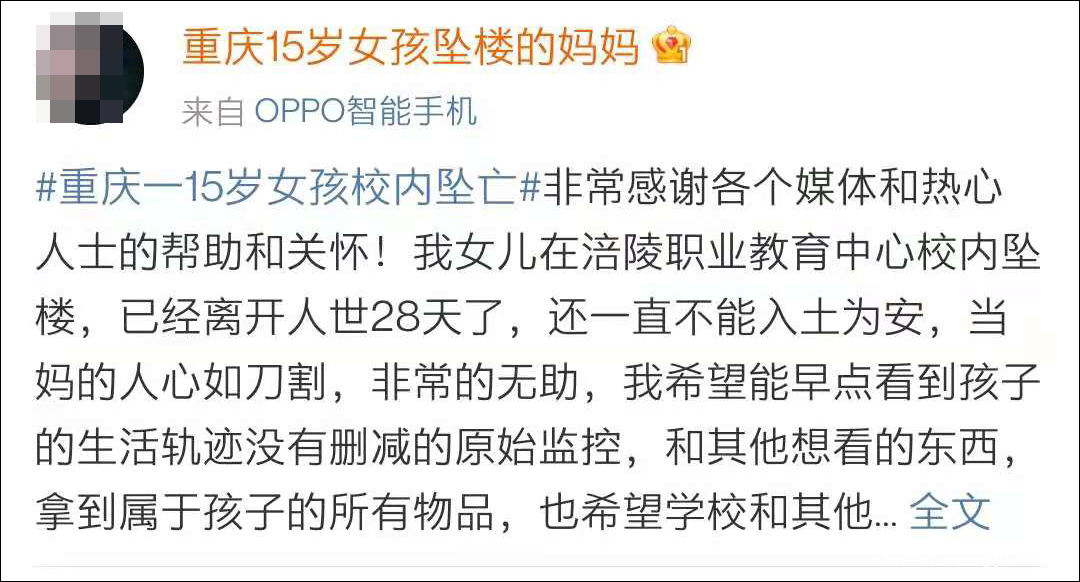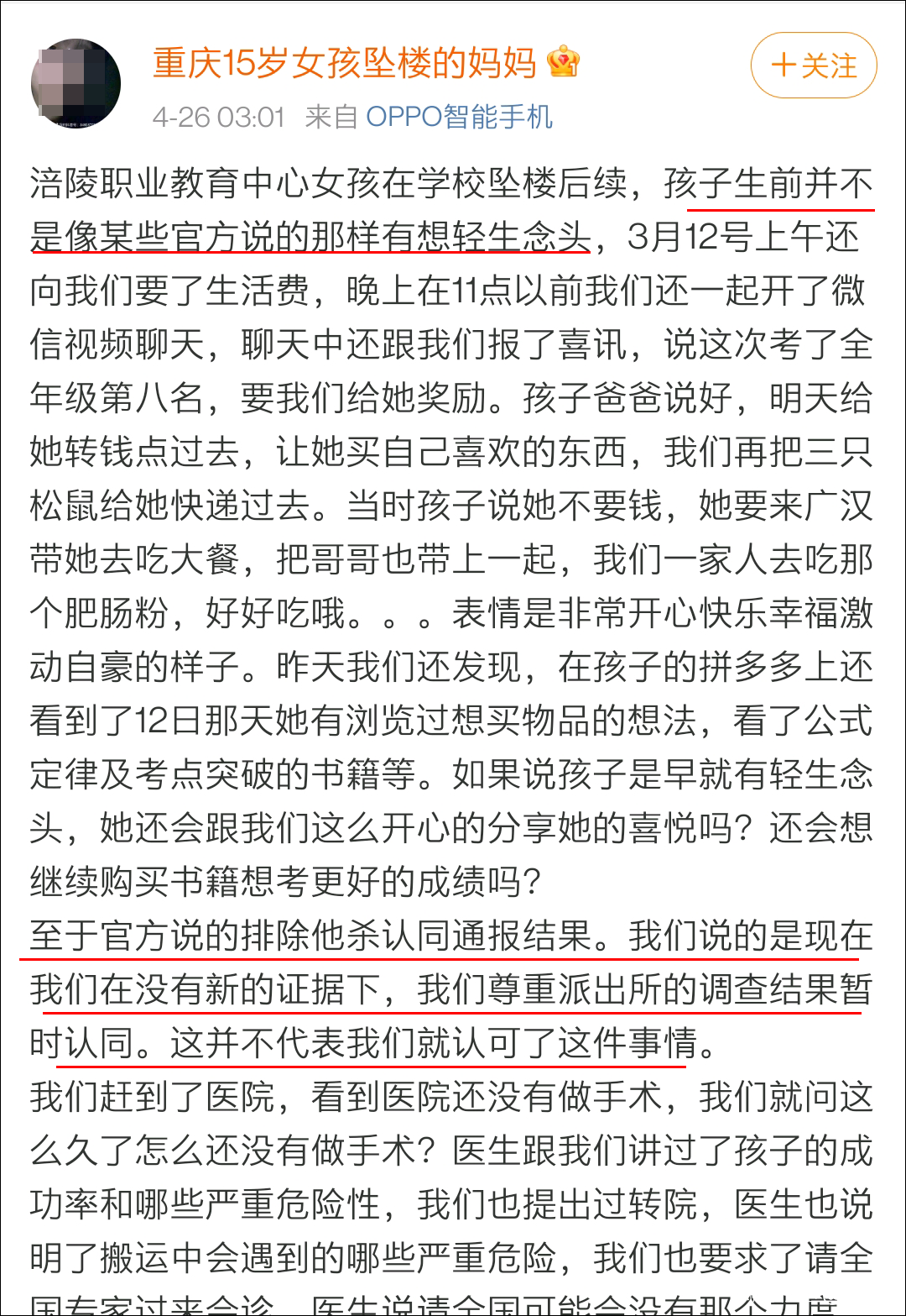 3月14日晚間,重慶涪陵職業教育中心一名15歲女學生從五樓墜落,搶救19天后死亡。4月24日,重慶涪陵官方通報稱,案件符合高墜特徵,排除他殺。但墜亡女孩家屬並不認同這一結果,認為此事的疑點重重,女孩媽媽吳女士不斷在微博發聲,呼籲真相。