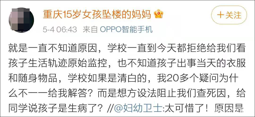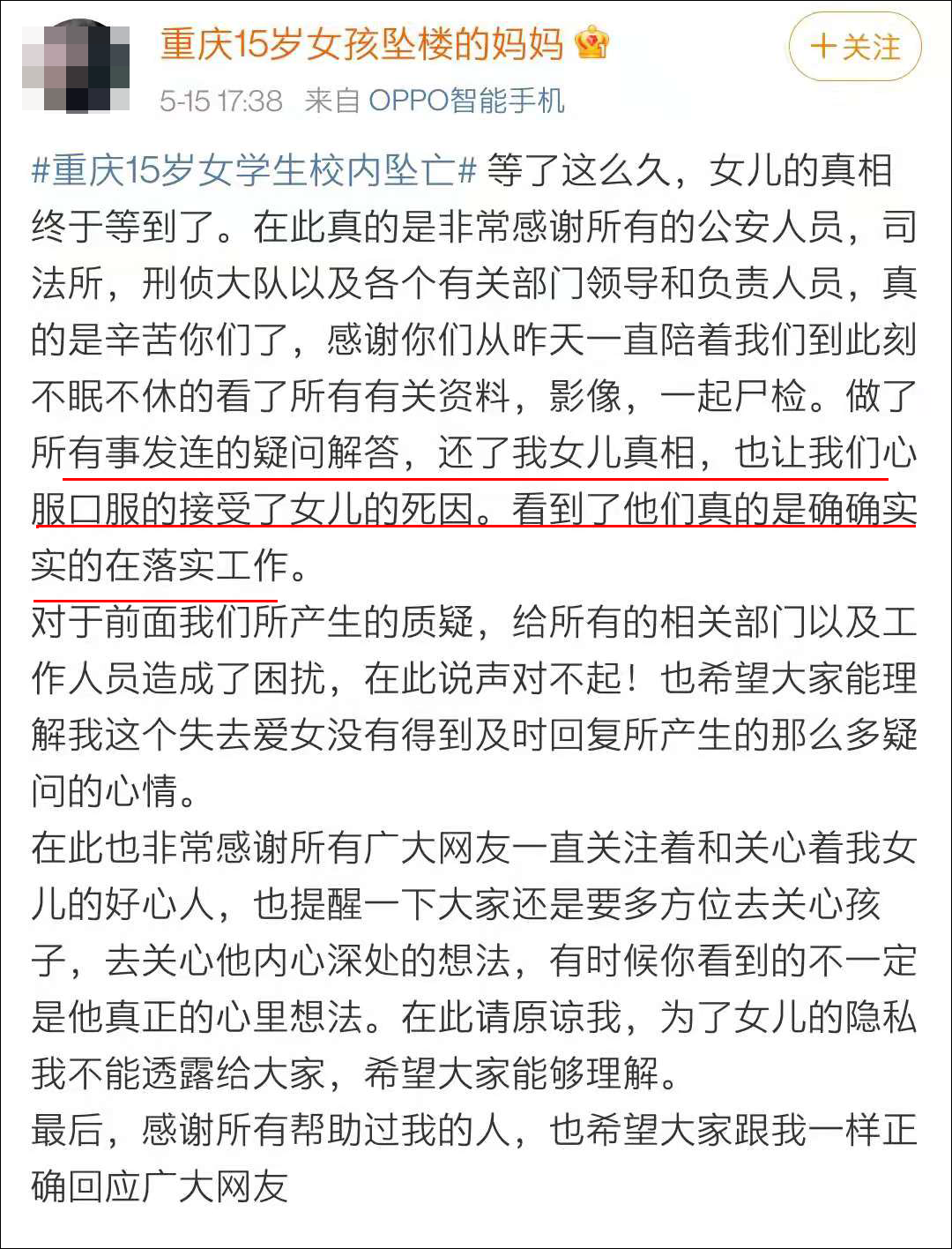 5月15日,@重慶15歲女孩墜樓的媽媽 發佈微博,表示自己終於等到了女兒校內墜亡的真相,心服口服地接受了女兒的死因。對於自己此前產生的質疑給相關部門以及工作人員造成困擾,@重慶15歲墜樓的媽媽 表示抱歉。