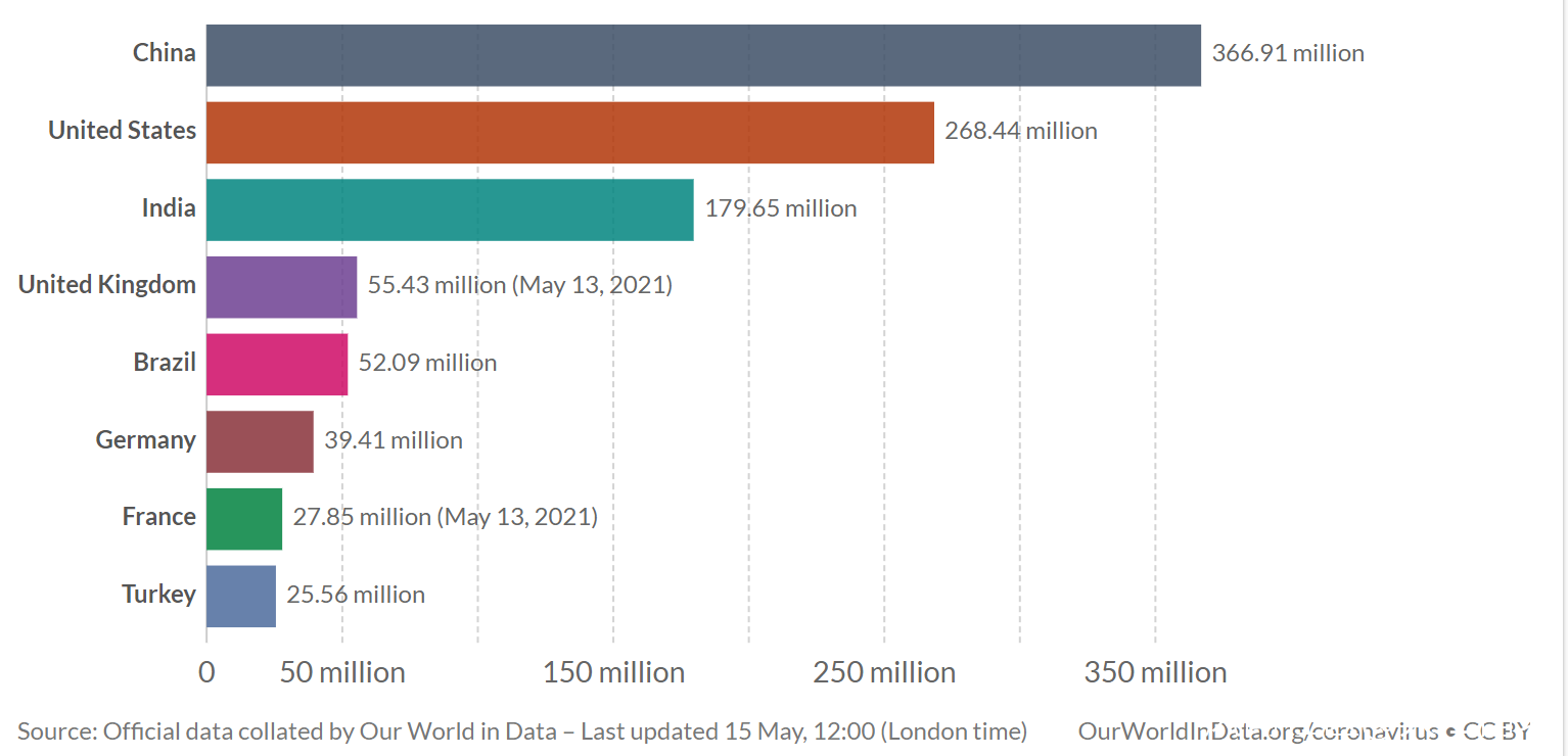 截止2021年5月14日,美國累計接種2.68億劑,居第二位,其中單日新增接種184萬劑。美國至少接種一劑的人羣佔比為46.4%,完成兩劑次的人羣佔比為36%。美國每百人累計接種80.26劑,是中國的3.04倍。自3月23日以來,美國日均接種268萬劑,為中國同期日均接種數的47%。