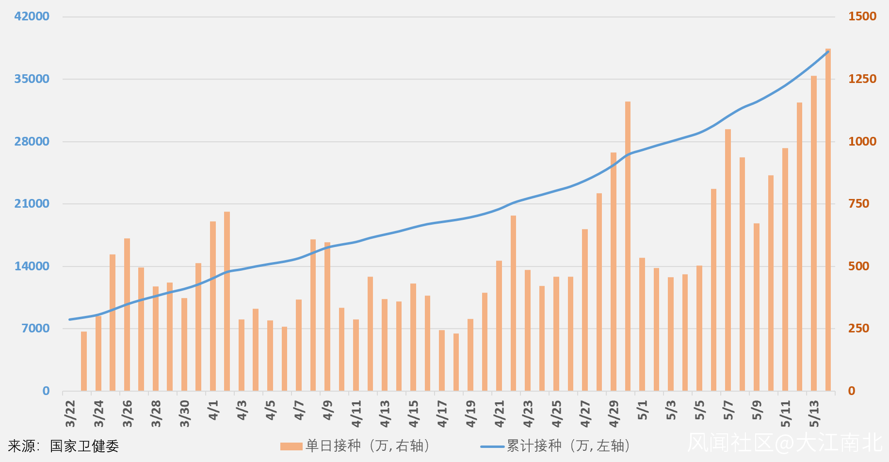 截止2021年5月14日,中國大陸累計接種新冠疫苗3.81億劑,繼續位居全球第一位,其中單日新增接種1372萬劑,環比增加108萬例,再創紀錄。我國自3月23日以來,日均接種566萬劑。中國每百人累計接種26.44劑,環比增加0.95劑。