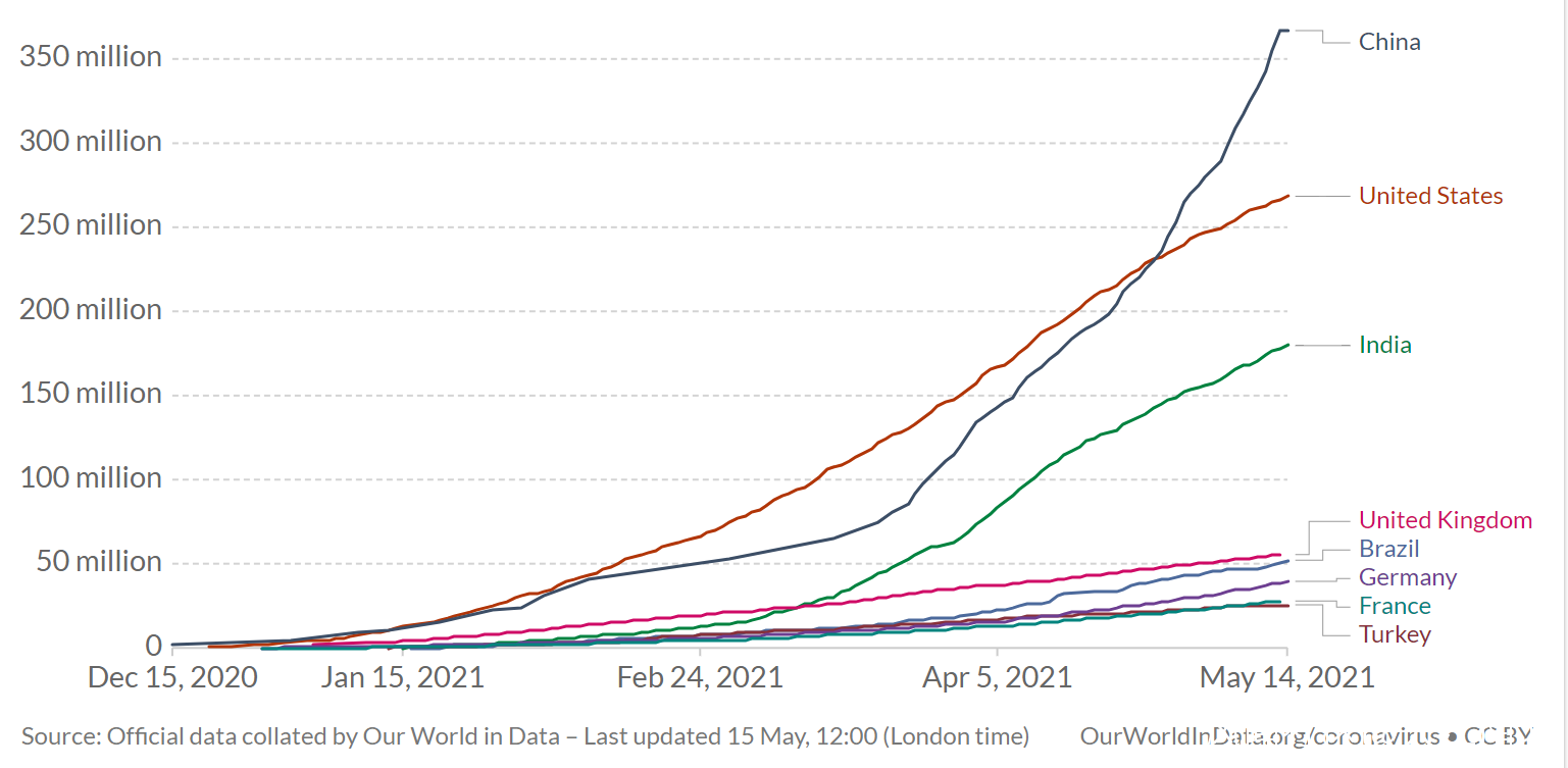 截止2021年5月14日,印度累計接種1.80億劑,列第三位,其中單日新增接種129萬劑。印度至少接種一劑的人羣佔比為10.1%,完成兩劑次的人羣佔比為2.9%。印度每百人累計接種****13.2針,是中國的49%。自3月23日以來,印度日均接種247萬劑,為中國同期日均接種數的44%。