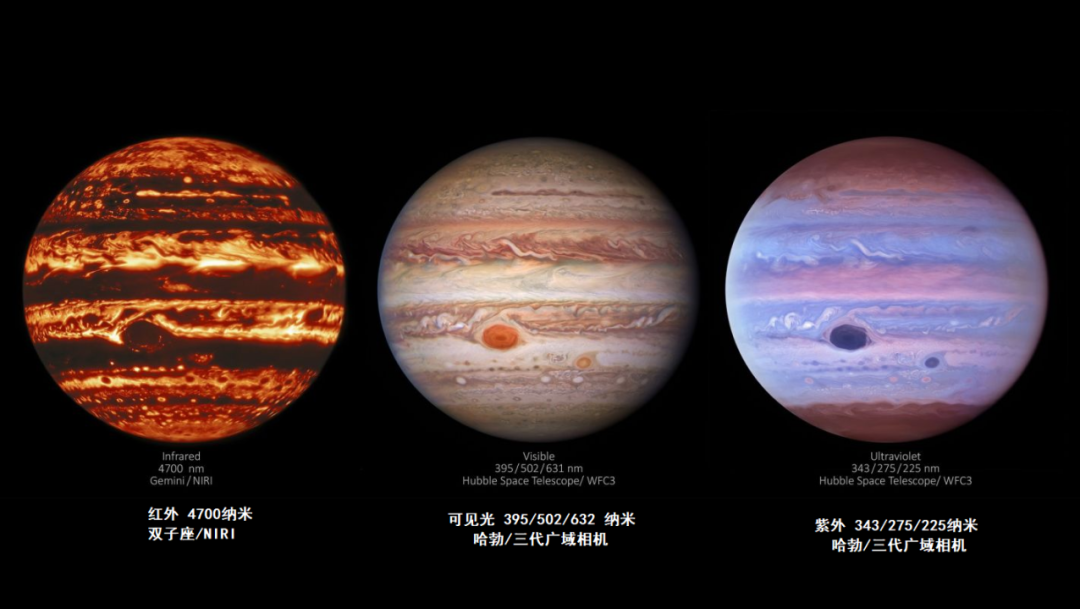 木星在可見光波長,紫外波長和紅外波長下的圖像對比。