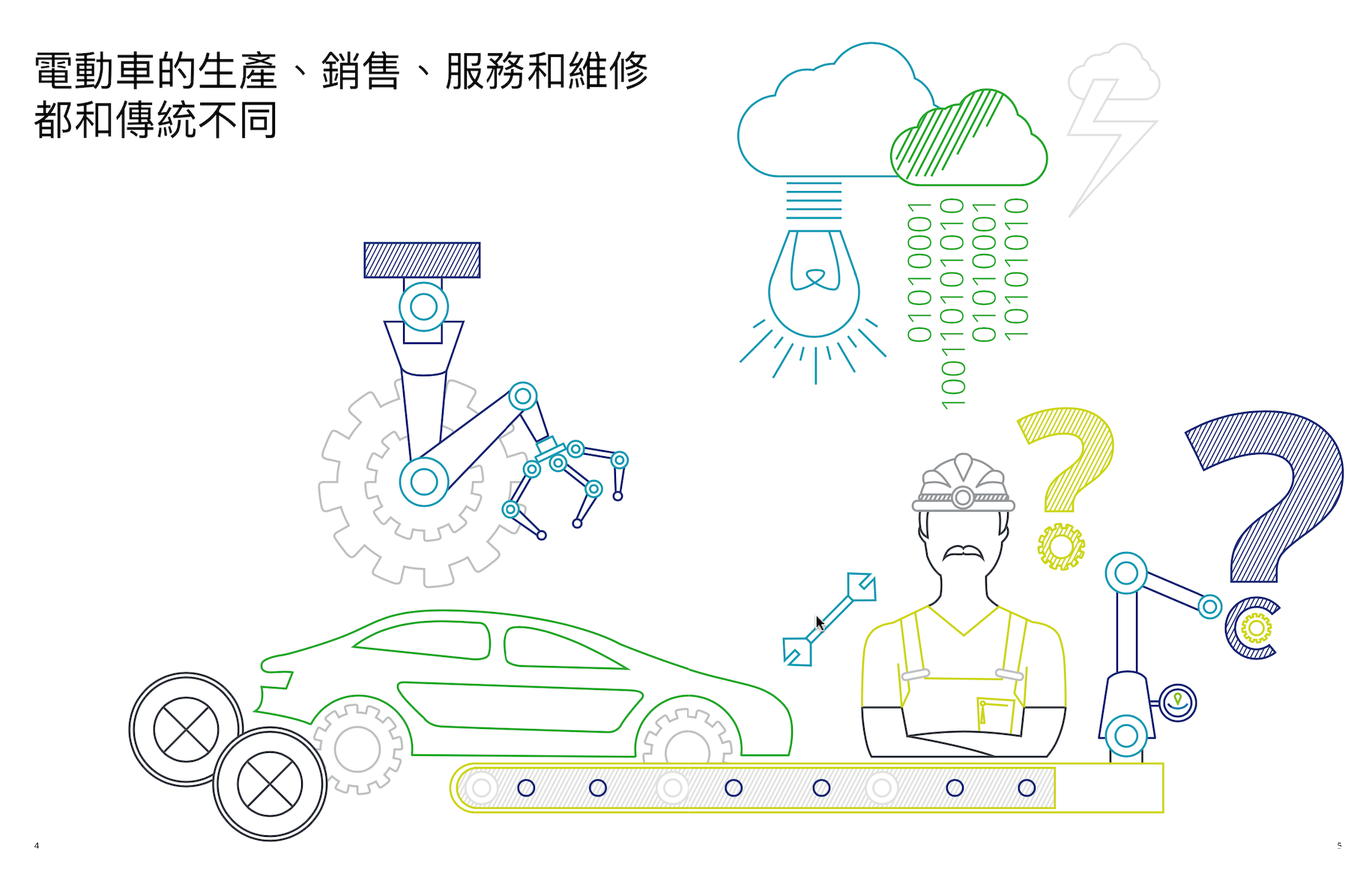無論説法有否誇張?都説明瞭電動車將會改變燃油汽車的傳統操作方式,從產品的前生今世,即是生產丶銷售丶服務和維修都和過往不同了,相應電動車的整個營運流程都將改變。那就是説,整個行業的從業員,他們需要的工作技巧都不一樣。汽車不再需要定期換油,以往精於變速箱丶發動機丶傳動器的機械師,無可避免地要學習完全不同的直接驅動馬達,以及完全由軟件控制的駕駛操控裝置,尤幸汽車向懸掛丶加速和煞車系統早已電子化,否則學習壓力可不少。