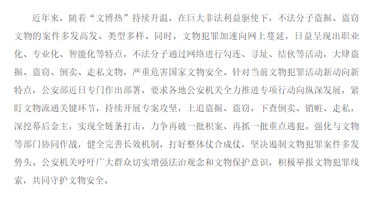 中華人民共和國公安部於2021年4月25日發佈《全國打擊文物犯罪專項行動成效顯著》