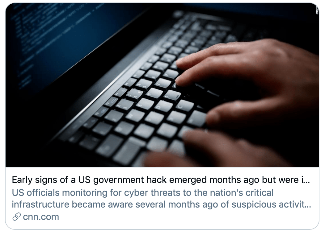 2020年,黑客利用了太陽風公司(SolarWinds)的系統漏洞,入侵了美國多個聯邦機構及財富500強企業的網絡,被視為是美國史上最嚴重的黑客襲擊事件。