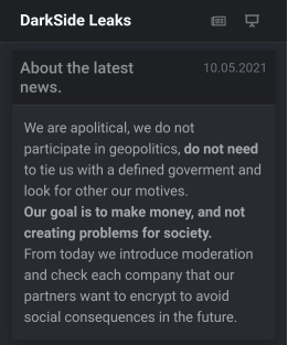 事發第4天(10日),DarkSide主動在暗網發佈聲明,説他們**“只想要錢”,並“不想給社會找麻煩”**。