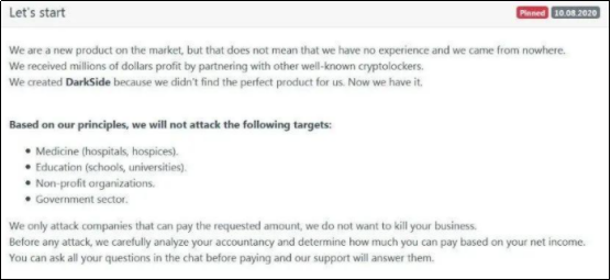 DarkSide是有勒索禁區的,其明確表示不會入侵醫療機構、教育機構、非盈利組織、政府部門這些非商業機構,要為充斥着黑客攻擊的世界留下最後一片淨土。
