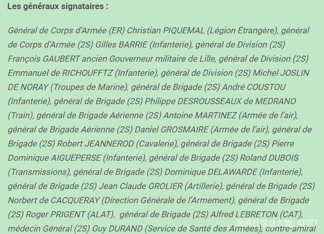 4月份法國《價值》週刊刊登了包括25名退役將軍在內的共1500名軍方官員的聯名公開信