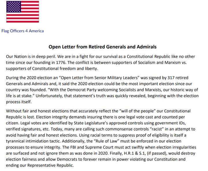 這些退休的高級軍官,一起指控現任總統操縱選舉,竊取國家,對美國憲法發動全面而無恥的攻擊,然後在美國大搞馬克思的社會主義制度