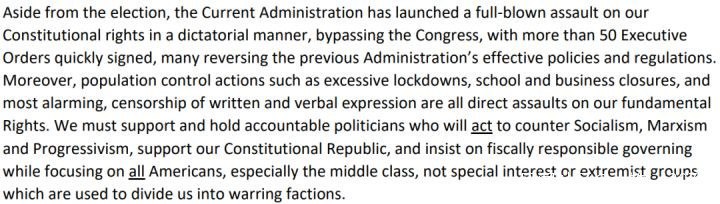 在拜登領導下,美國已經左轉,朝向馬克思主義形式政府,我們必須站出來捍衞我們的國家不受到馬克思主義的控制,我們敦促所有美國人和地方或州以及的代表們加入到拯救美國的行動中來