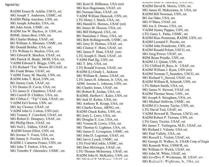 後面就是洋洋灑灑的一大串,美國退休高官和軍隊軍官的聯合署名,共計124人