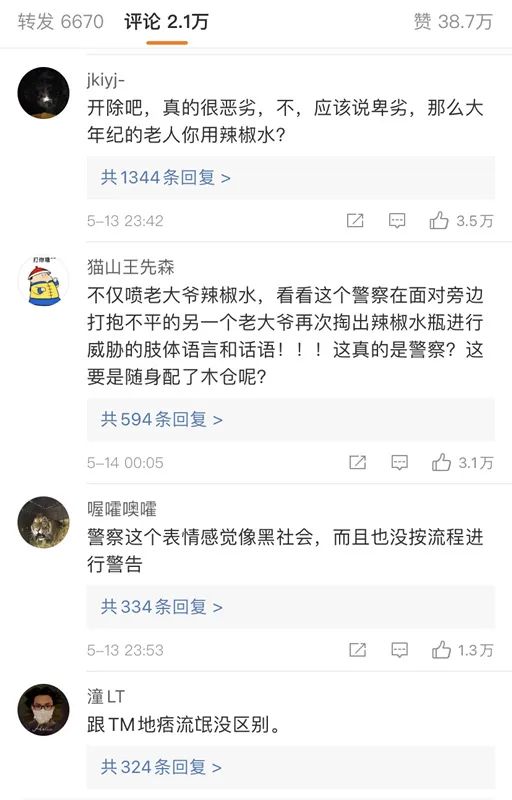 這個場面,被路人以第三人稱的視角拍攝了下來,並且只截取了交警最後噴辣椒水的那一小段,發到了網上。