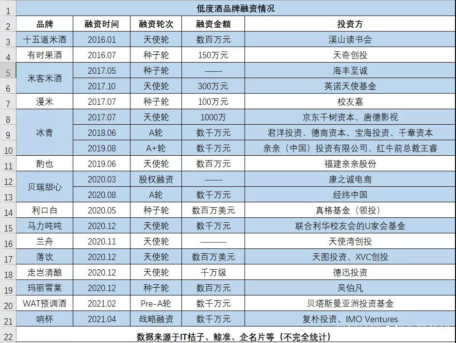 據不完全統計,從2016年至今,行業內至少15個品牌獲得融資,其中冰青完成三輪融資。僅2020年以後,就有9個低度酒品牌獲得融資。